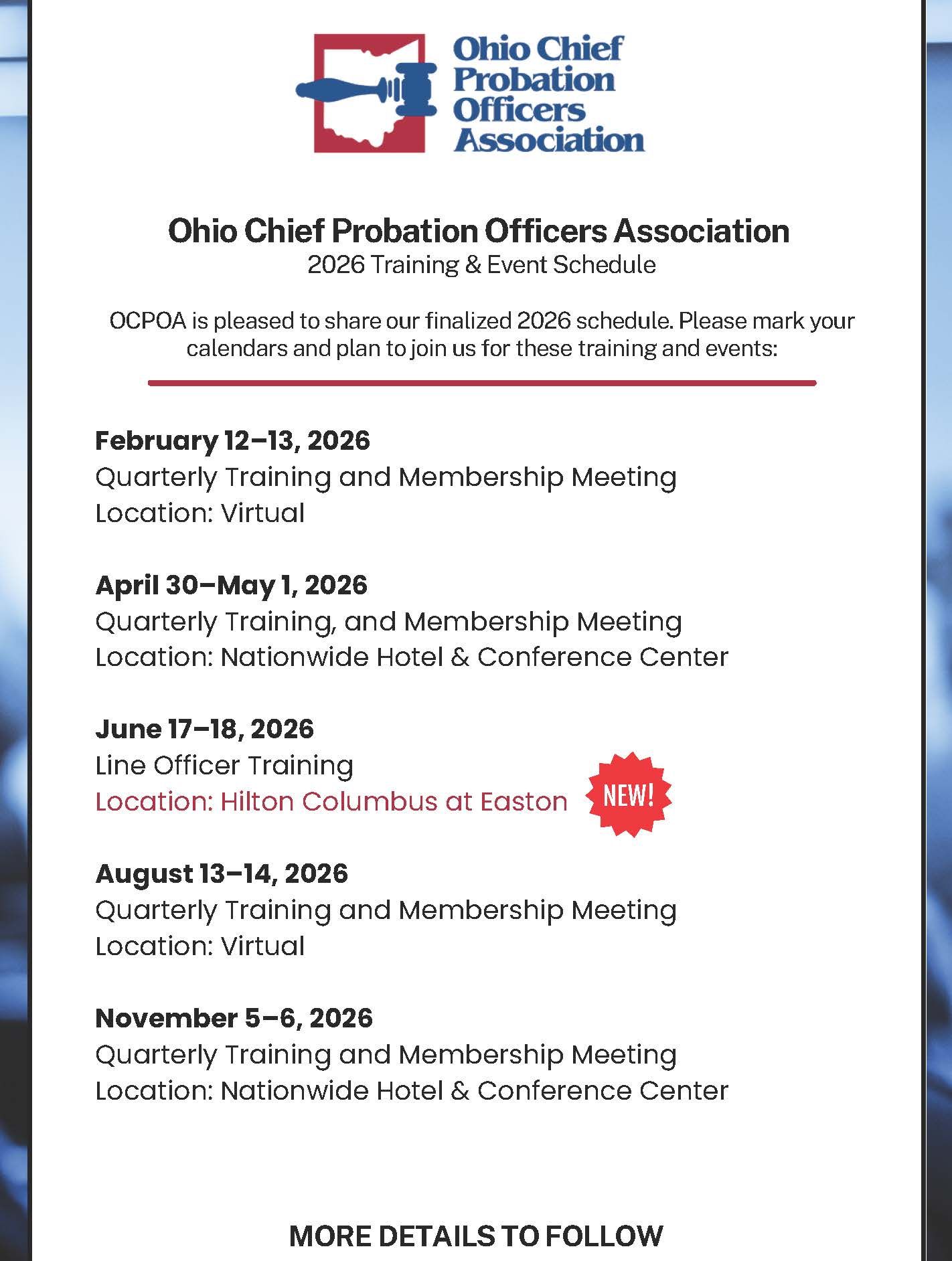 Free registration for our quarterly meetings where you can engage in high quality professional development and earn continuing education units coupled with an additional half day of networking and learning around legislative issues impacting Ohio's probation practices.
